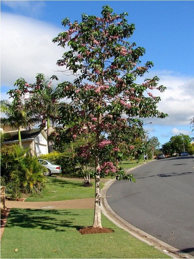 This is a really attractive tree that has beautiful pink trumpet shaped flowers. Tabebuia trees are often used as street trees in Brisbane and so will be familiar to many. They’re right up there with Jacarandas in terms of both size and floral display.